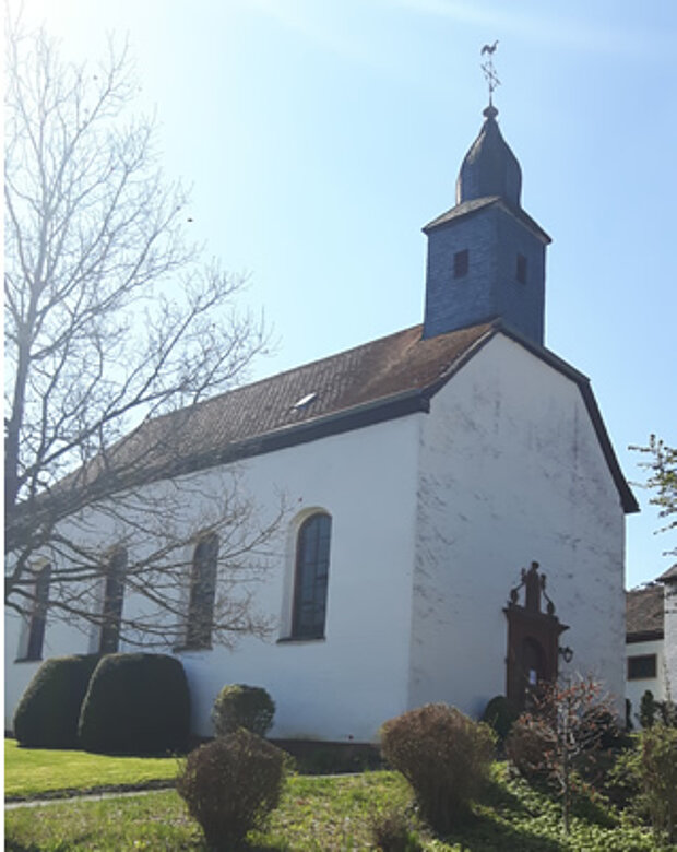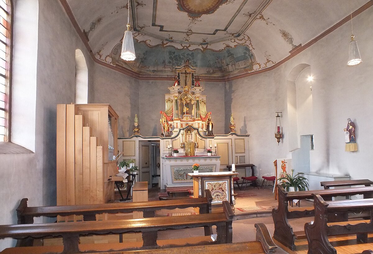 Diese – tagsüber leider geschlossene – Hubertuskapelle wurde nie ein Raub der Flammen und im Visitationsbericht (= Protokoll anlässlich eines Bischofsbesuches) von 1803 ist zu lesen, sie sei „ungemein schön“. Zu diesem schmeichel-haften Urteil wird auch sicherlich die Bemalung im Inneren der Kapelle beigetragen haben. Die Schlichtheit und Einfachheit der Deckenmalerei zeugt von echter bäuerlicher Kunst. Auch der Altar ist typischer Bauernbarock, farbenfroh und formenreich, aber nicht aufdringlich und nicht überladen. Allerdings ist die Kapelle heute in die Jahre gekommen und bedürfte dringend einer Renovierung – innen wie außen!