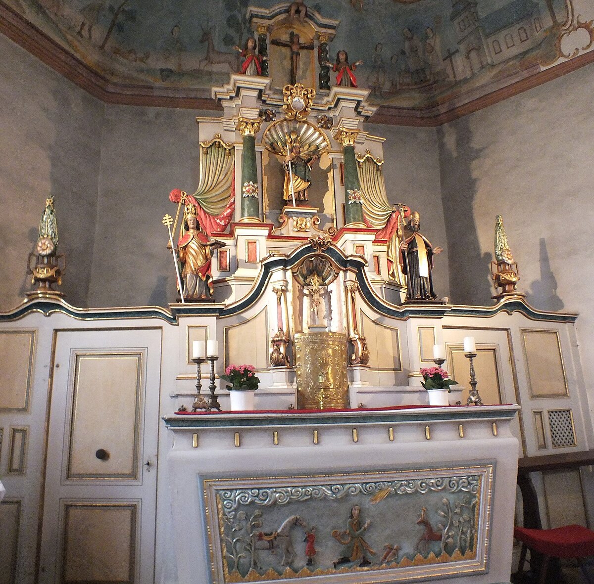 Der hölzerne Hochaltar wurde um 1710 von Pfarrer Lamberti angeschafft und ist in seiner schlichten Schönheit noch heute unverändert erhalten. Die Türabschlüsse, die zugleich als Beichtstuhl dienen, sind aus derselben Zeit. Auf der Mitte des Gesimses stehen hölzerne Vasen mit hohen Blumendekorationen. Auf dem Altar befinden sich die Figuren der Heiligen Hubertus, Blasius und Antonius. Der schräg zurückspringende Altartisch zeigt auf der Vorderseite seines Sockels eine einfache Szene aus der Hubertuslegende.